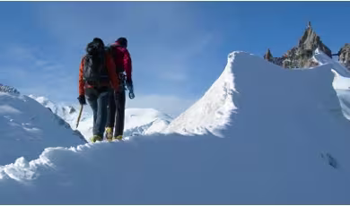 Generalmente lo spazio tra guida e cliente varia tra 1 e 5 metri, ma può cambiare in base al terreno, all’esposizione e alle condizioni della montagna.